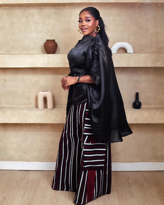 Bolanle Aso Oke African Hand woven Pant with Luxurious Organdy Exergerated Button down Shirt