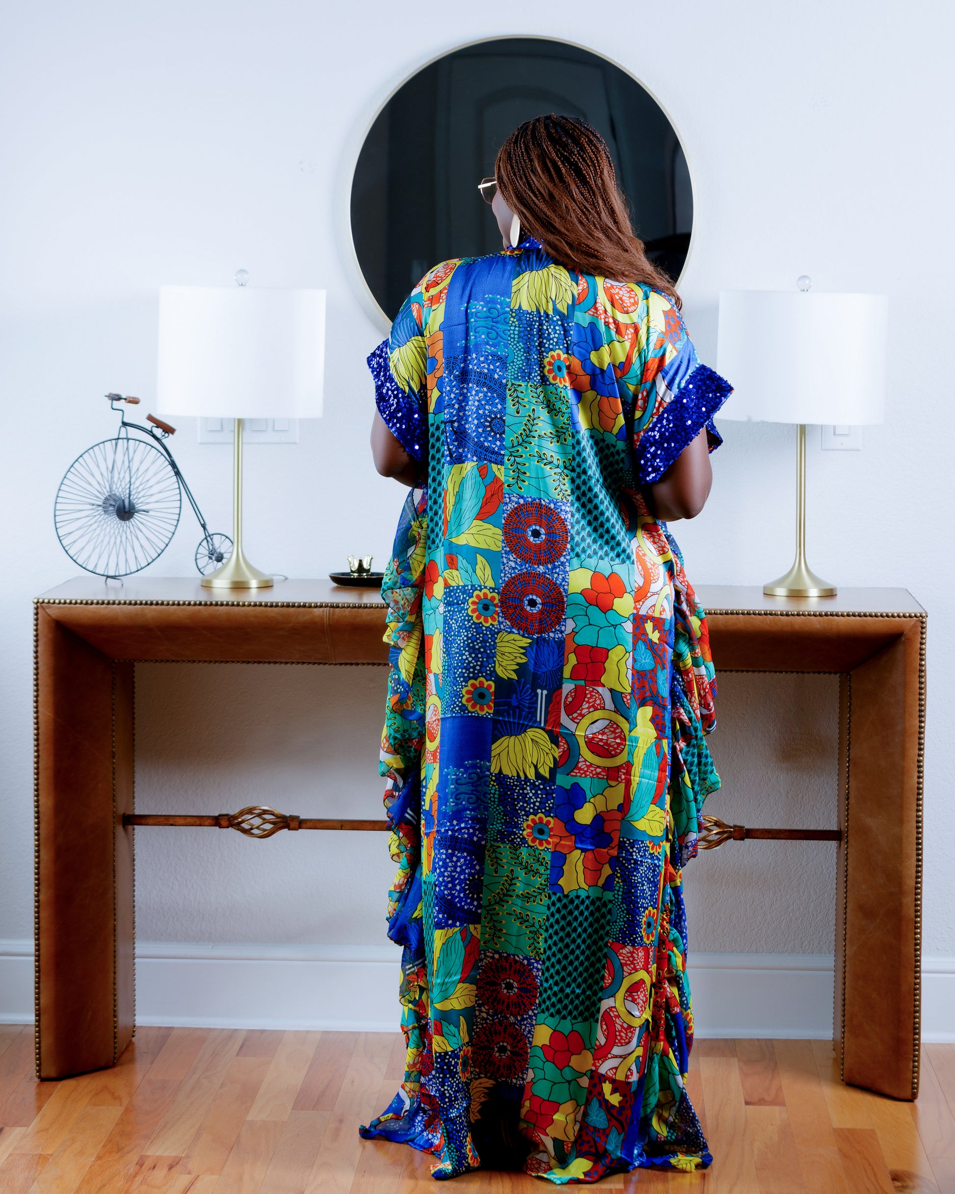The African Print Silk Boubou is a must-have for women who love fashion with meaning. Its bold, beautiful design is perfect for making a statement while paying homage to the rich culture and landscapes of Africa.