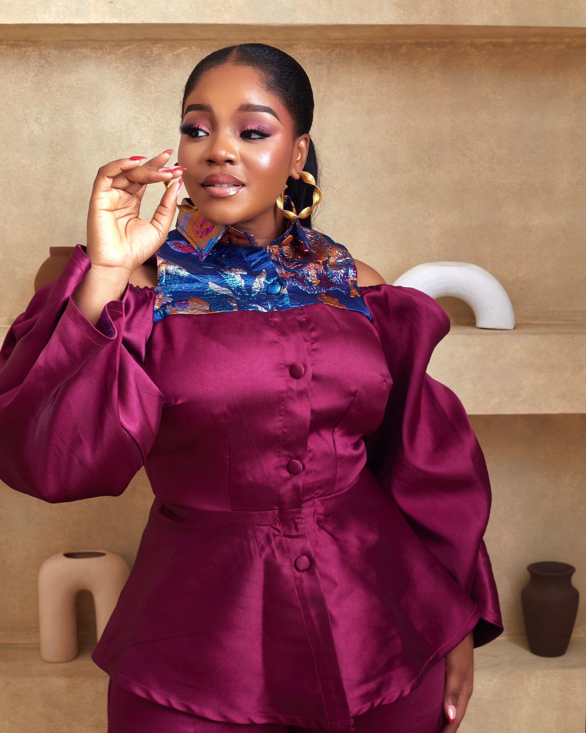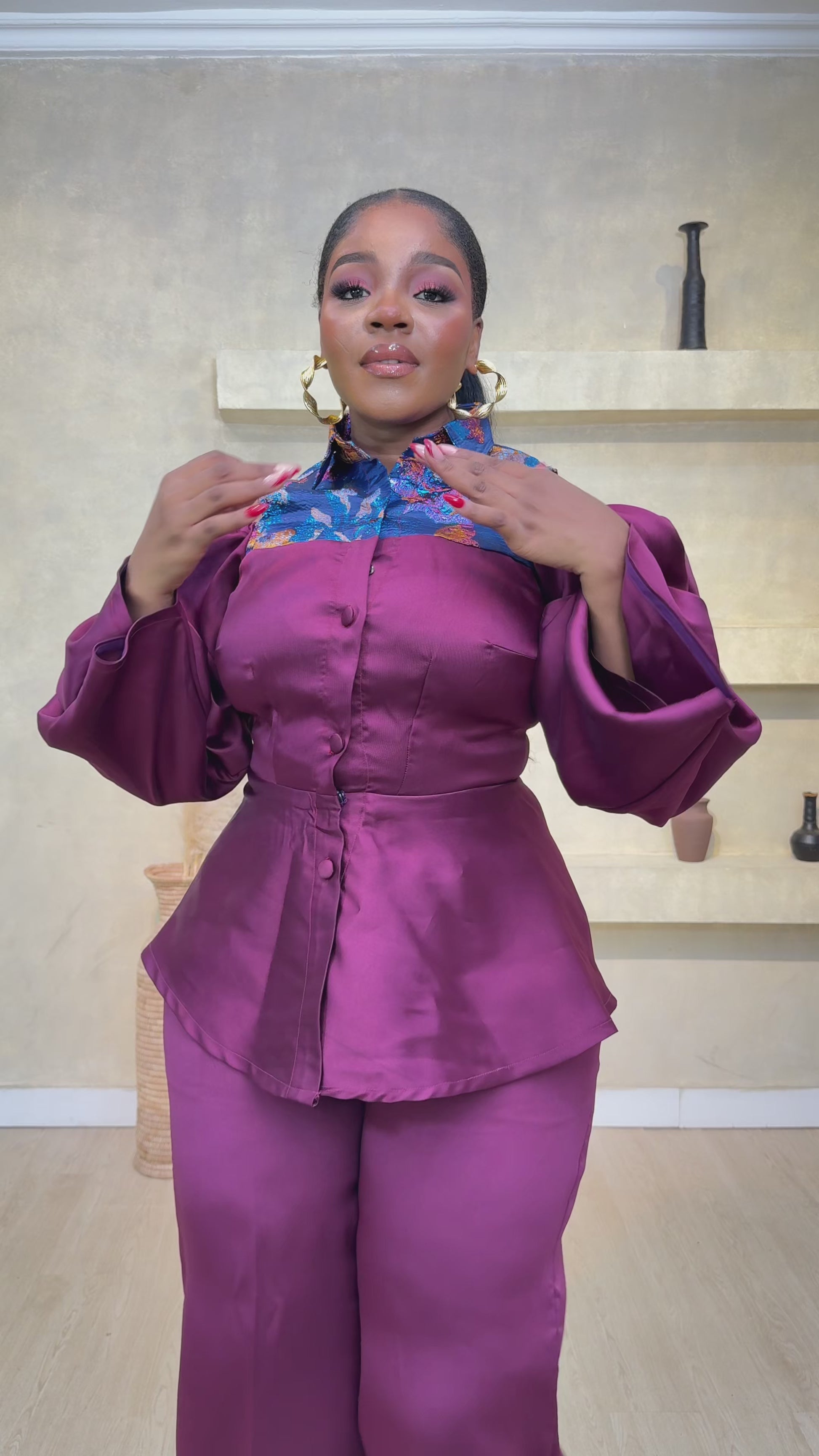 Adunni pant set is a cold shoulder peplum button down top made from Mikado silk and brocade damask fabric, the button down peplum top creates a standing out fusion while the exergerated bubble sleeves adds volume and sophistication to the overall outfit.