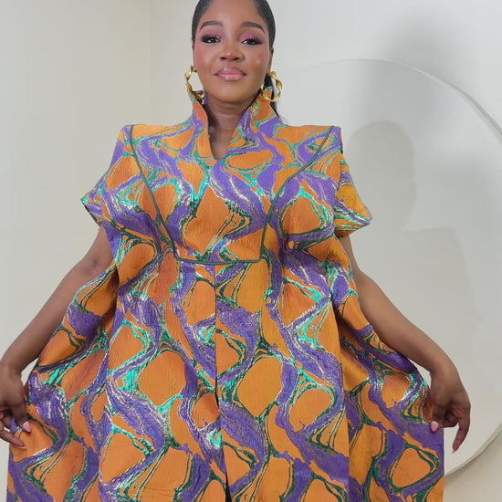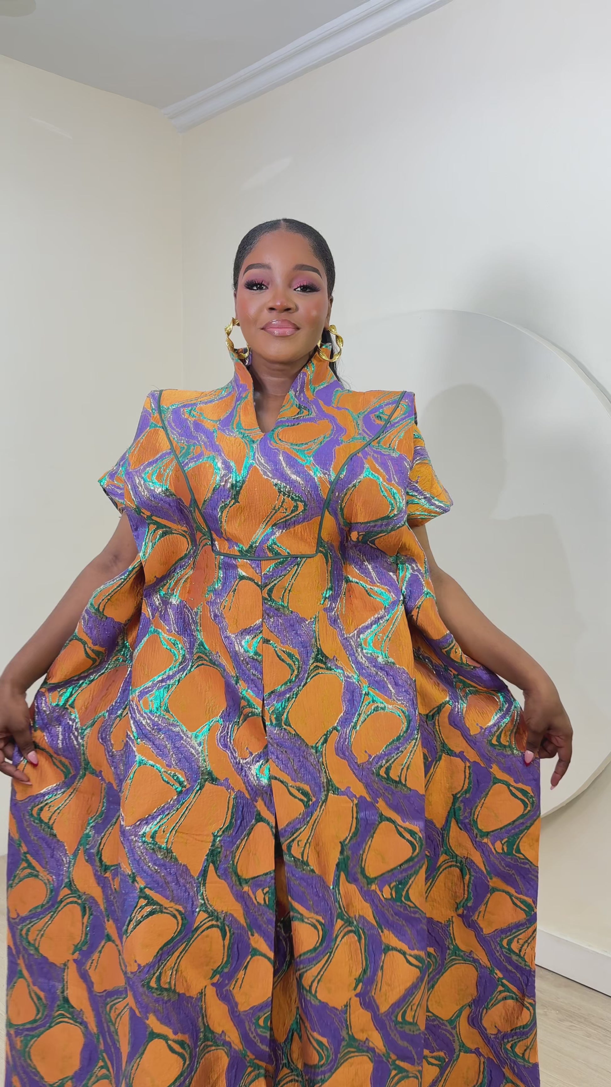 The built up neck line brocade Boubou is a luxurious maxi boubou made from rich brocade fabric, designed for the rich aunties. It is elegant and a classic. The sleeves are exaggerated agbada accentuates the dress. The boubou has inverted pleats detail