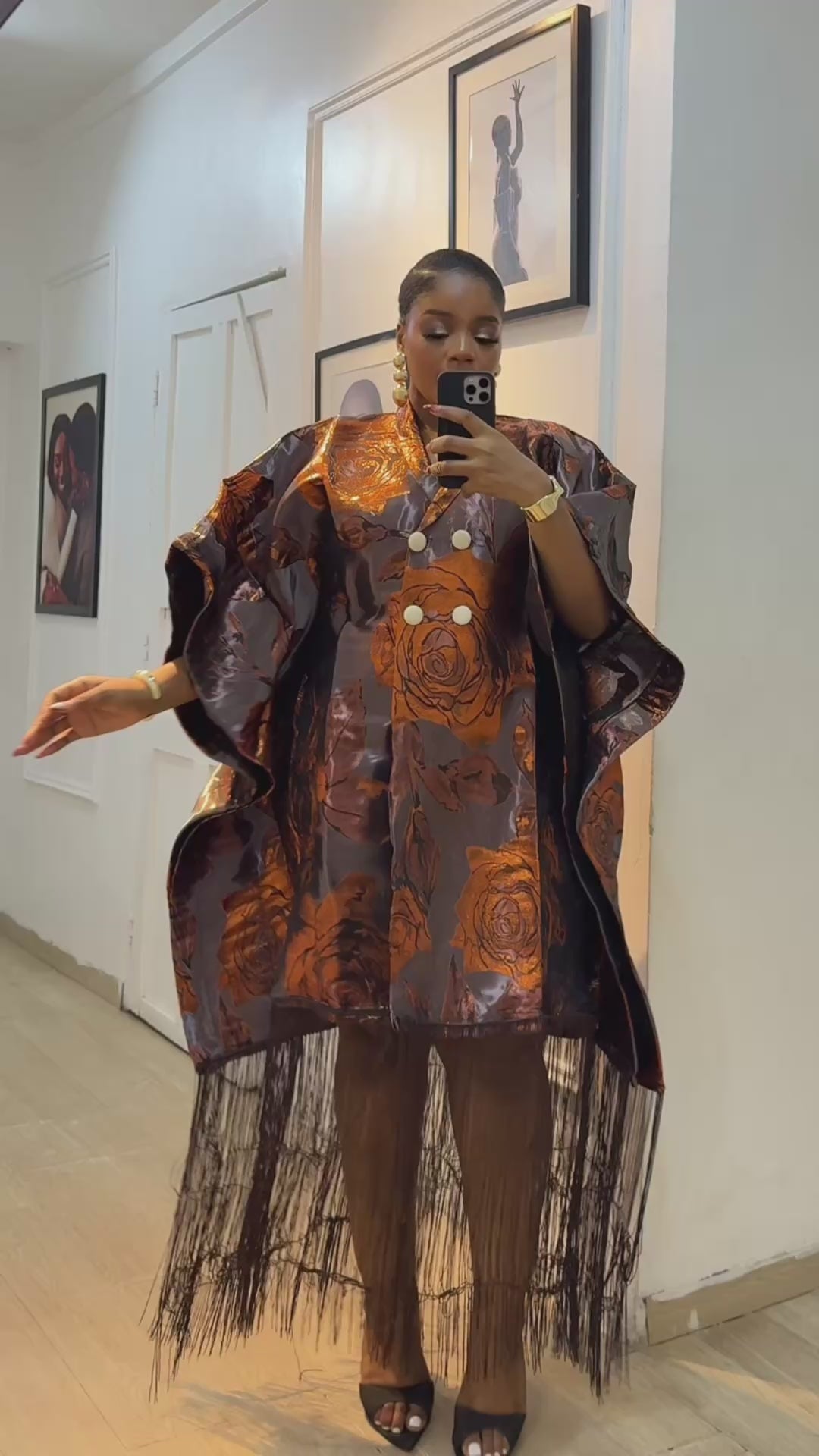 Crafted from premium, heavy-weight floral brocade fabric, this dress features a rich metallic palette of bronze, copper, and deep mahogany. The oversized, structured silhouette offers a dramatic "power-dressing" aesthetic while maintaining effortless elegance.