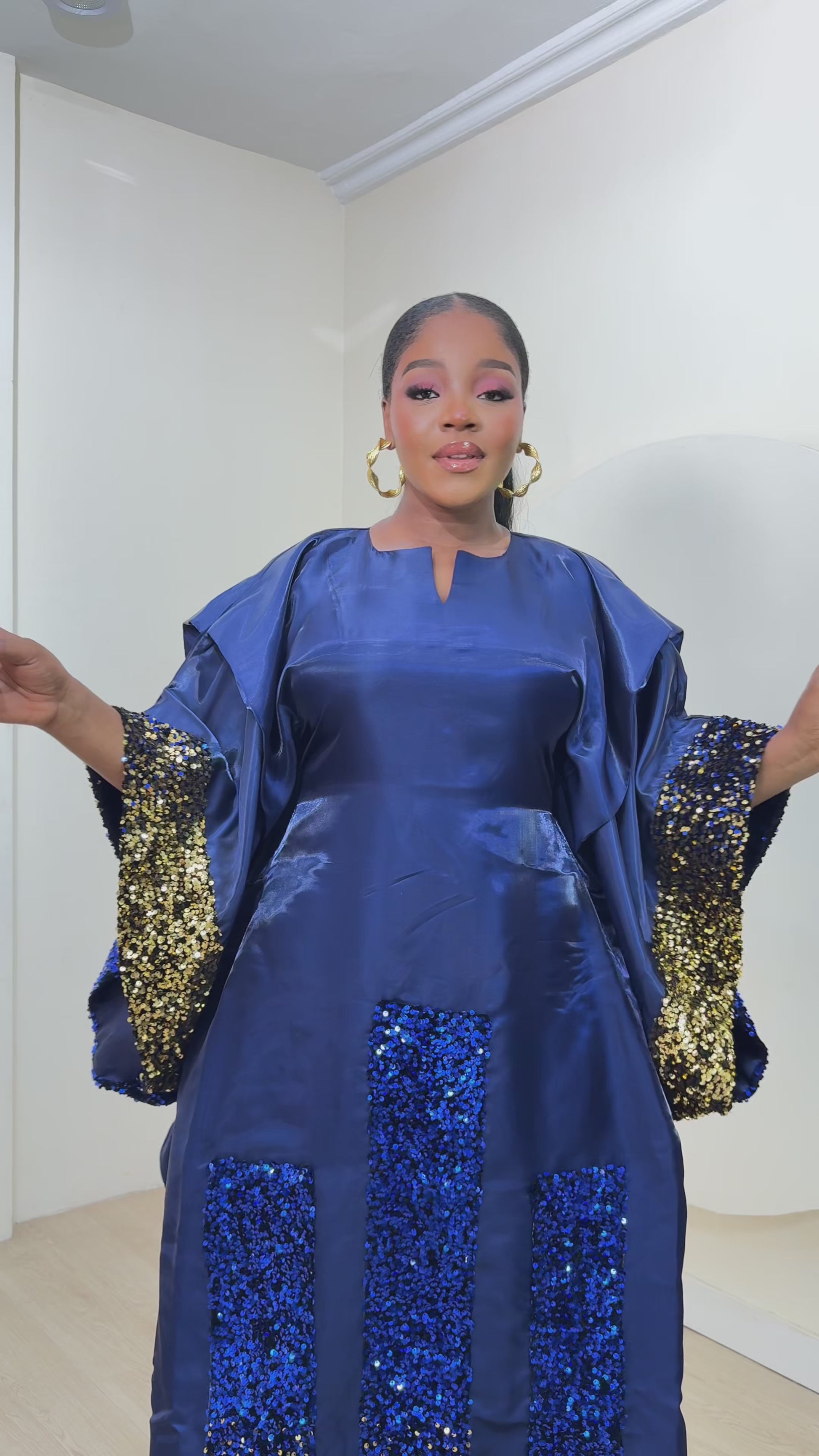Step into the spotlight in the all new best seller rich aunty Boubou, made from luxurious mercury Mikado silk fabric The boubou is detailed with a captivating array of multicolored sequin fabric. A perfect balance of comfort and style. A perfect look for the rich Auntie Era.