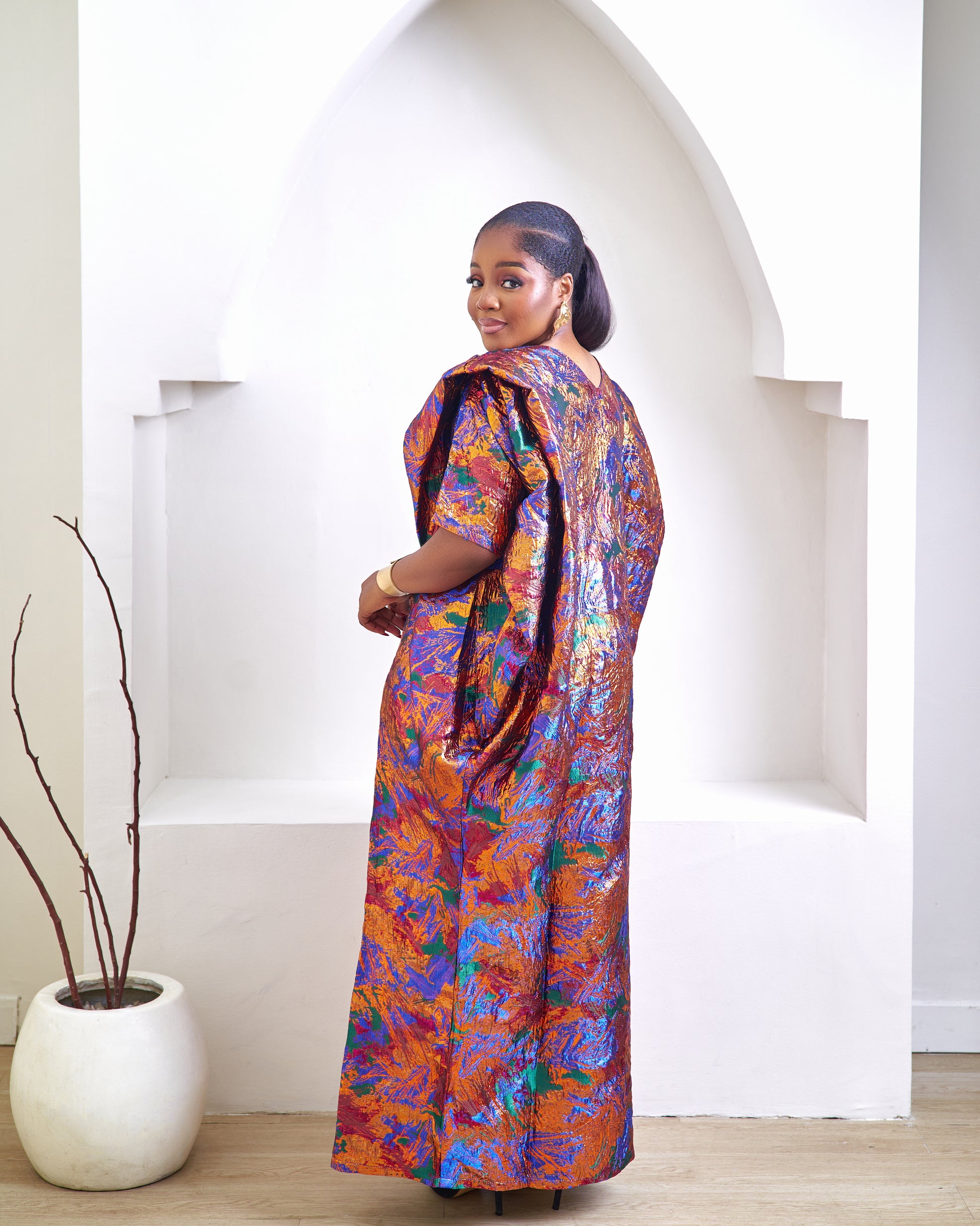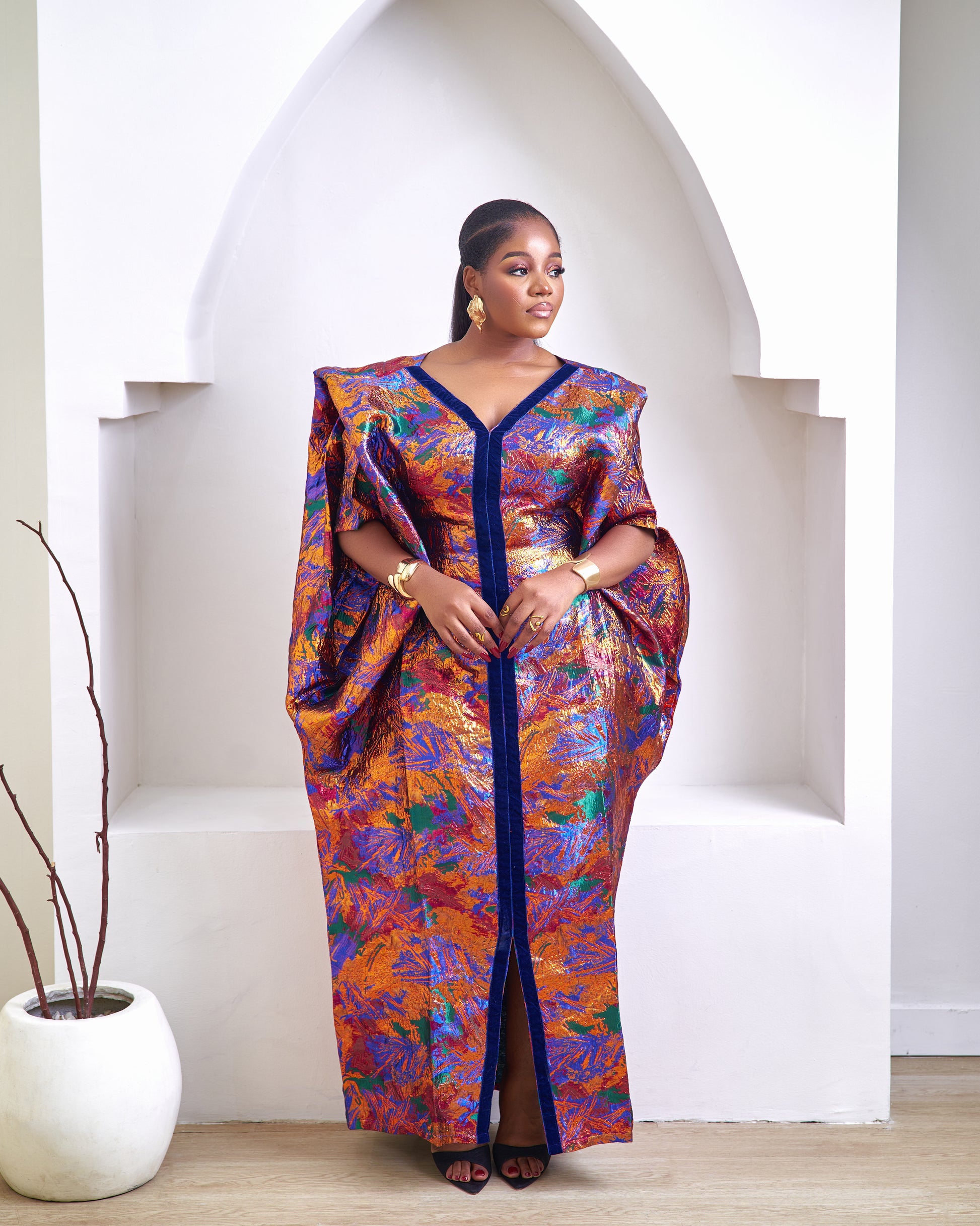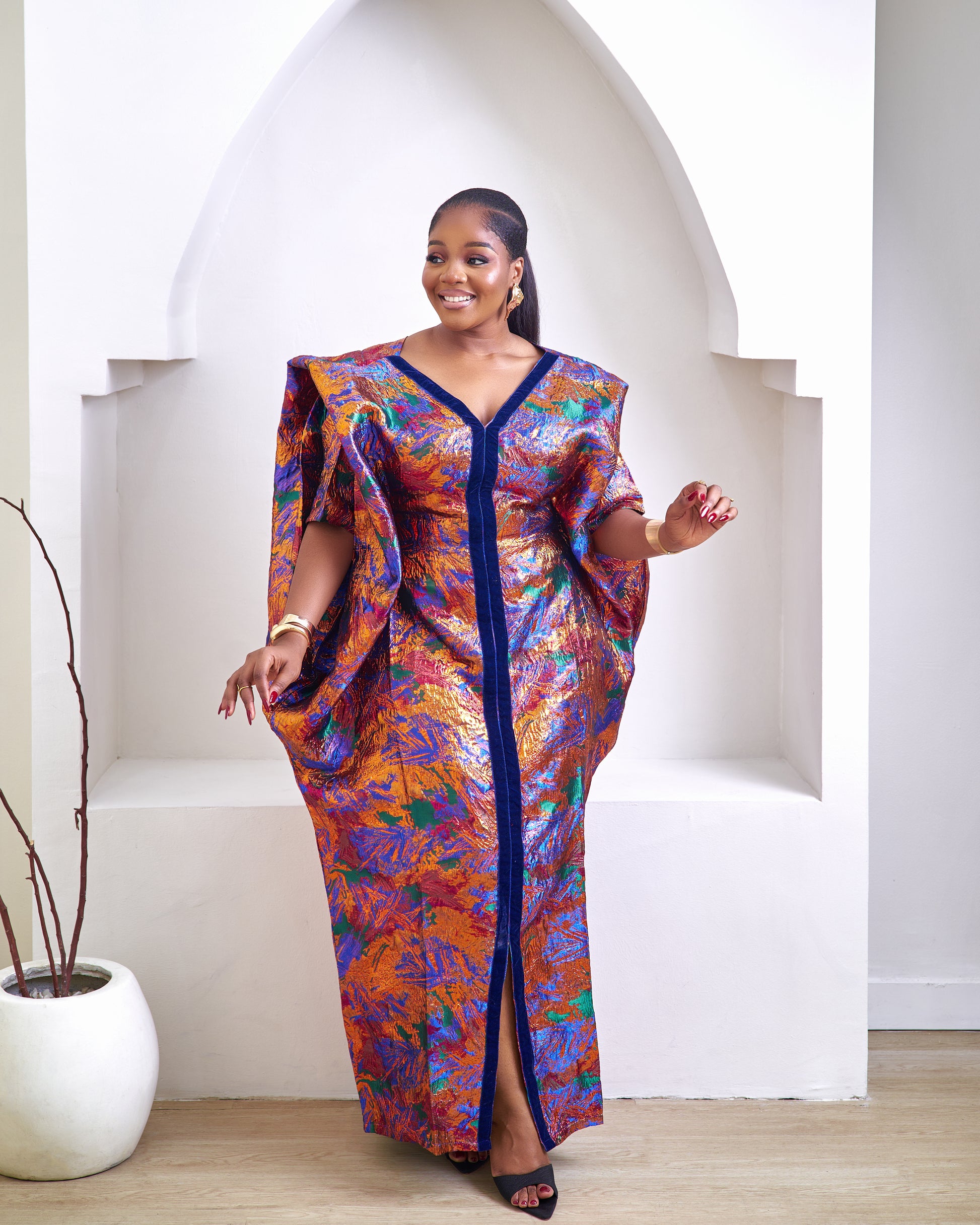 The Jamila African brocade Boubou is a luxurious maxi boubou made from rich brocade fabric, designed for the rich aunties. It is elegant and a classic. The sophisticated Sabrina neckline is detailed with luxurious velvet tapping that accentuates the dress. The boubou has inner hidden belt on the sides of the waist that allows you to style to you desired fit.