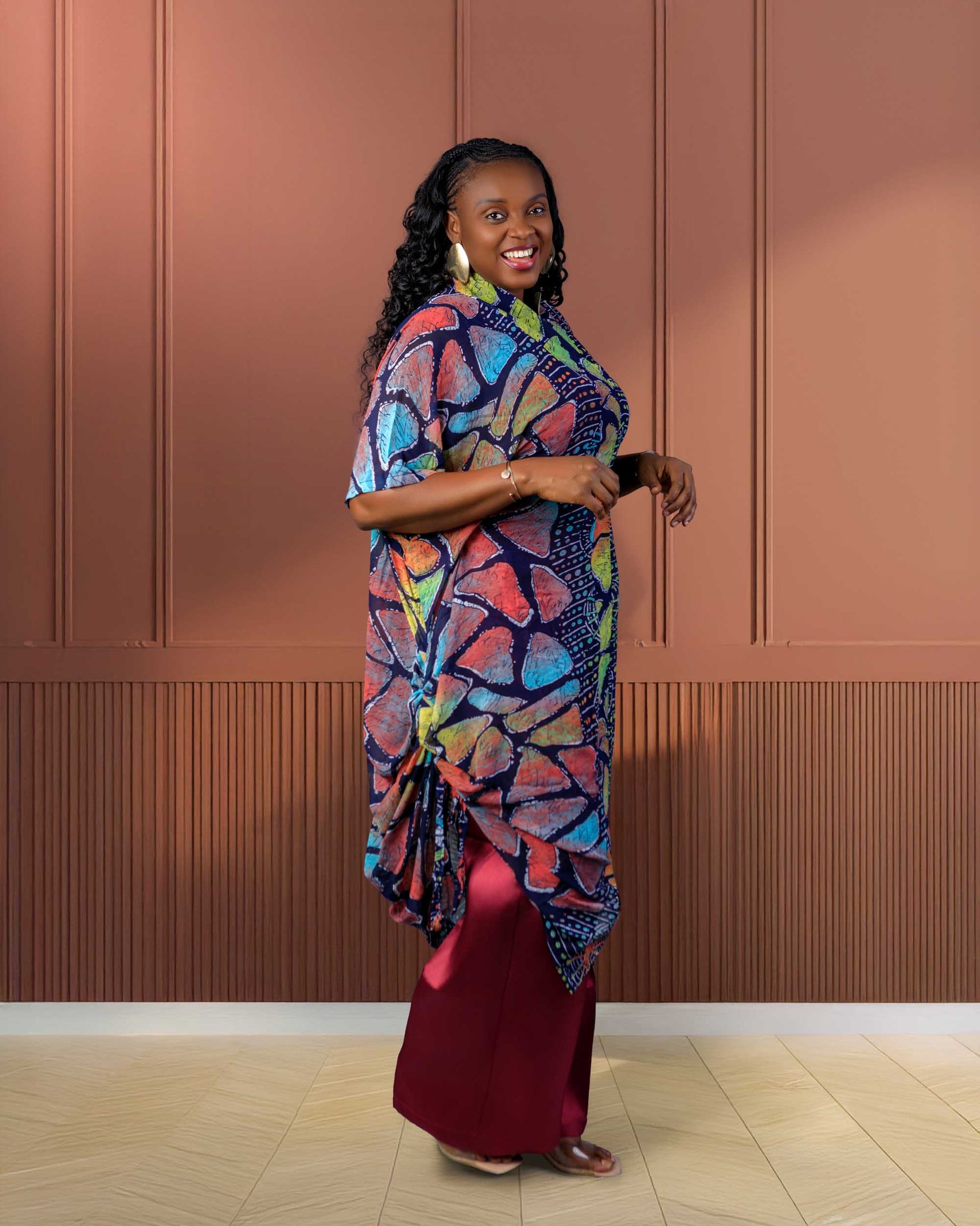 This stylish 2-piece pant set is crafted from vibrant chiffon african print fabric. The top, featuring a draw string boubou long top design. The pants is a luxurious Mikado silk pant measure 45 inches in length and are adorned with pockets on both sides.