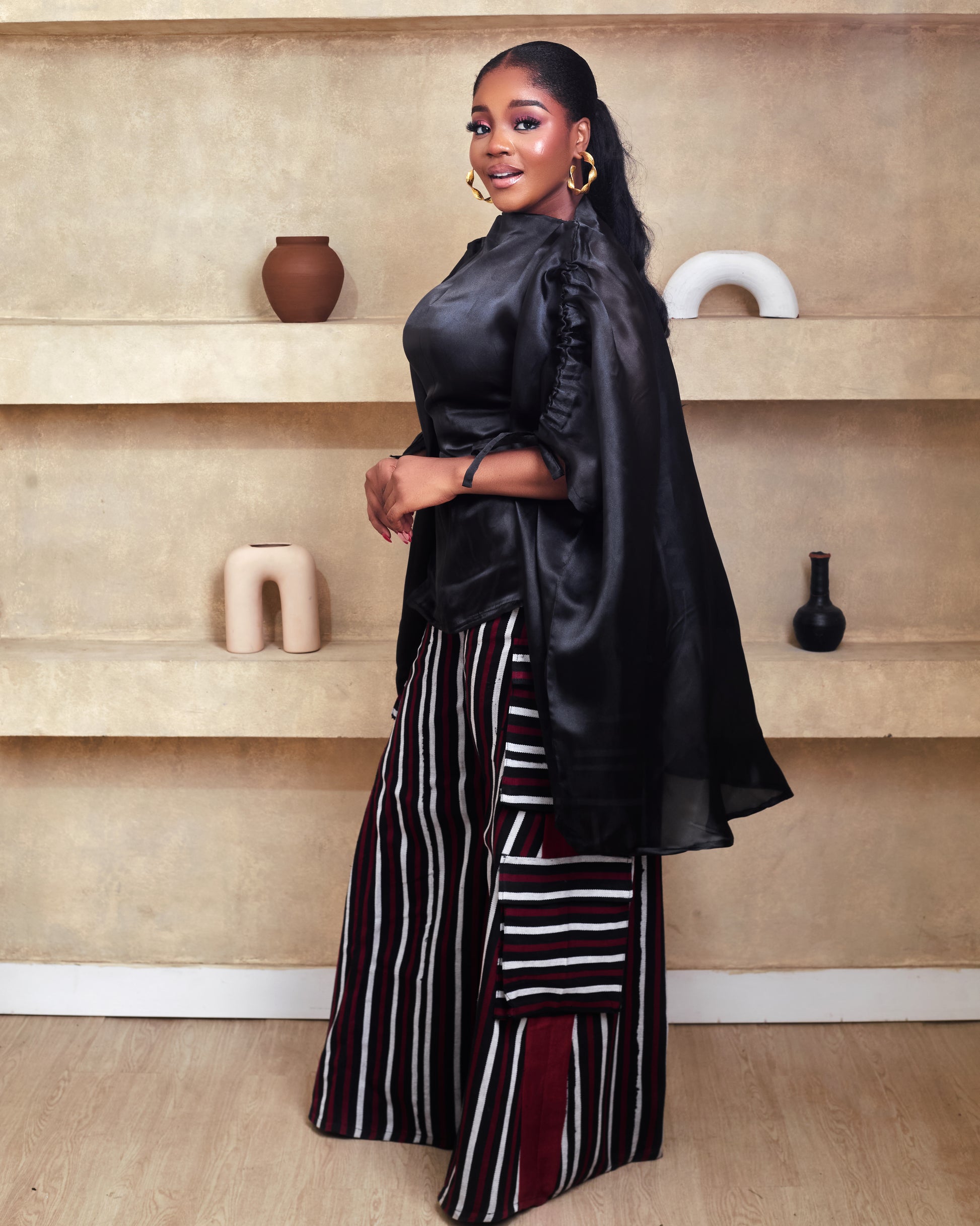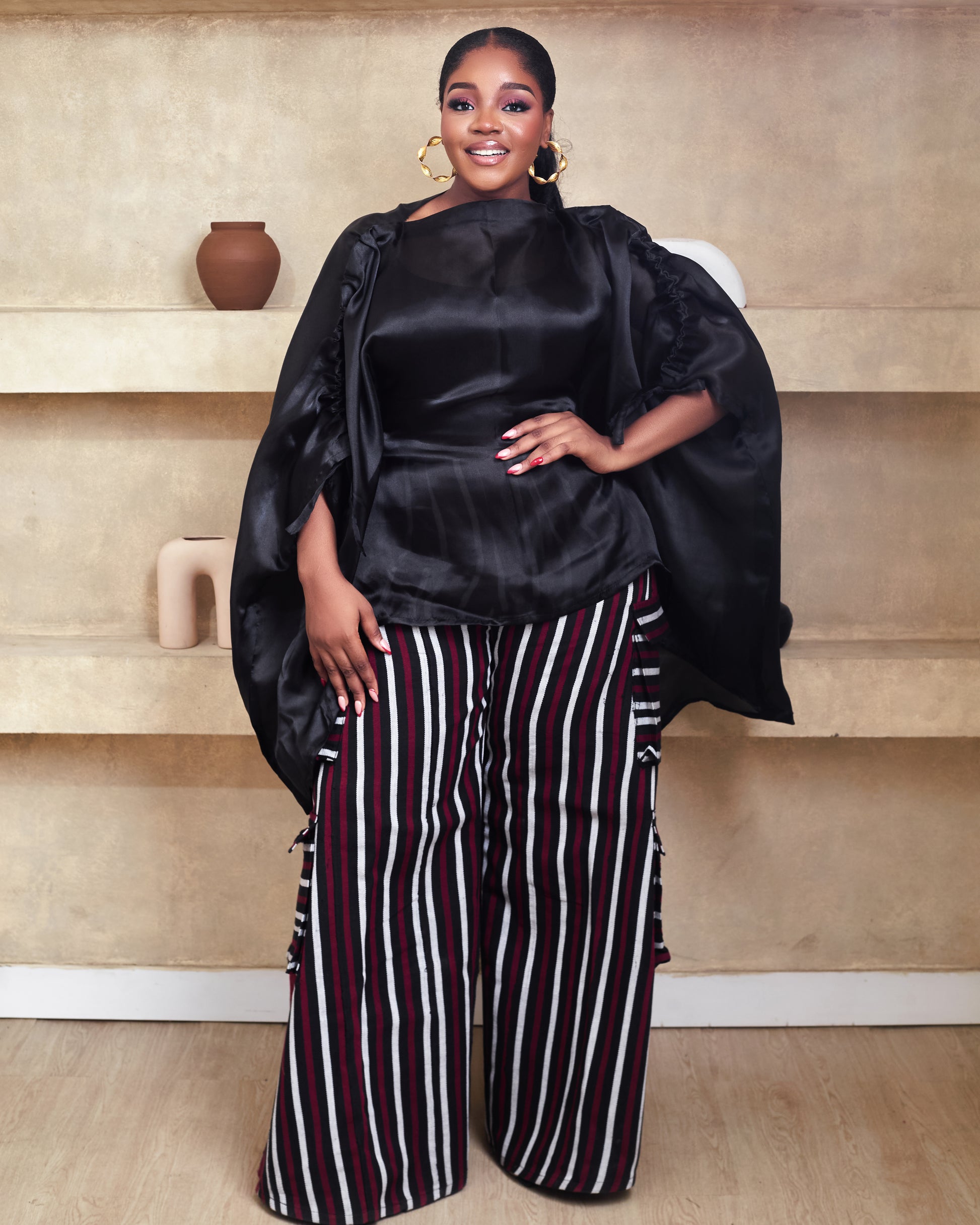 This aso oke pant made from traditional west african fabric into a classy palazzo pant with detailed cargo styled pockets for women. pants trousers comes with elastic waistband at the back. Boubou blouse comes with a hidden inner belt with a drawstring shoulder detail