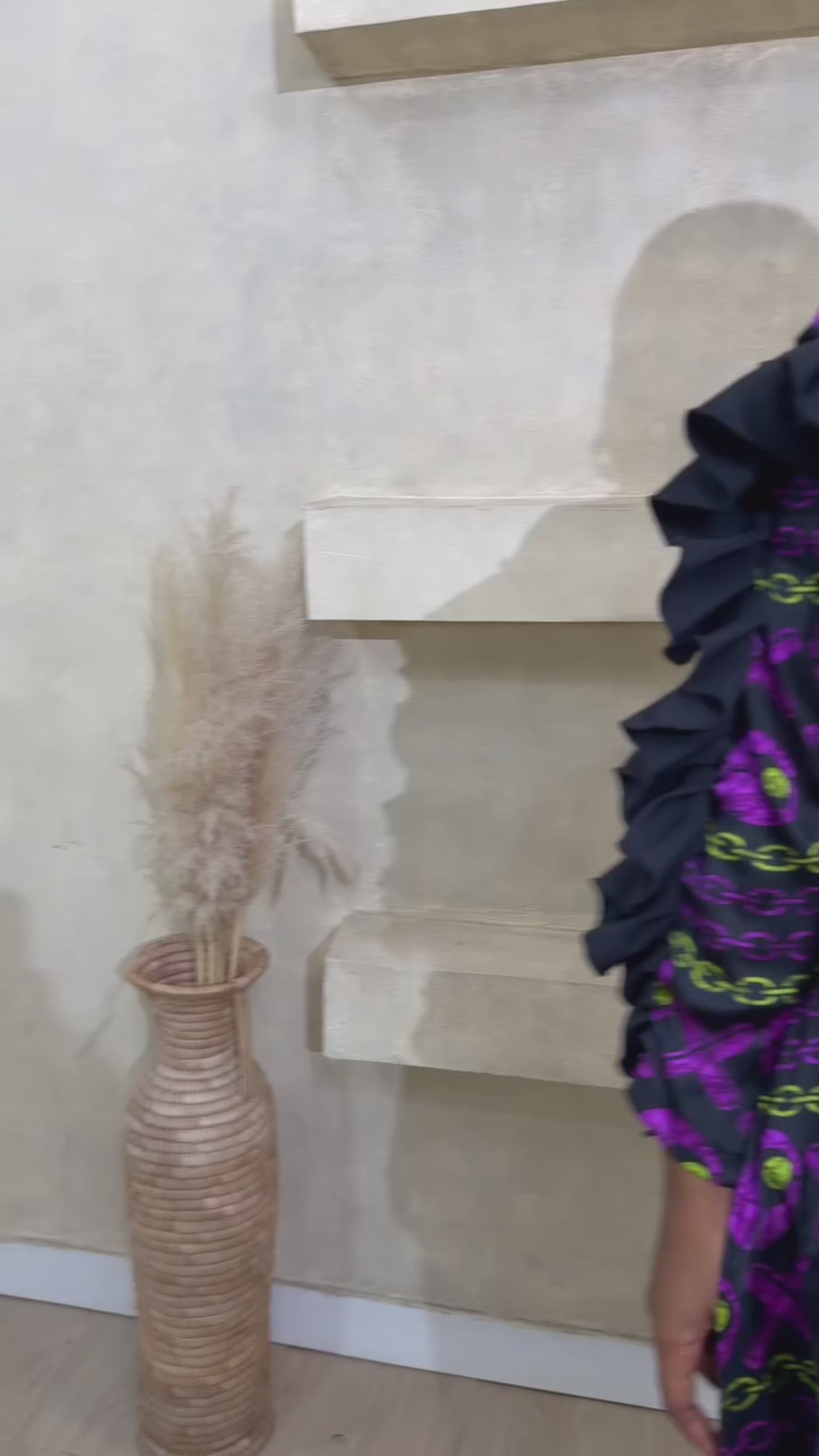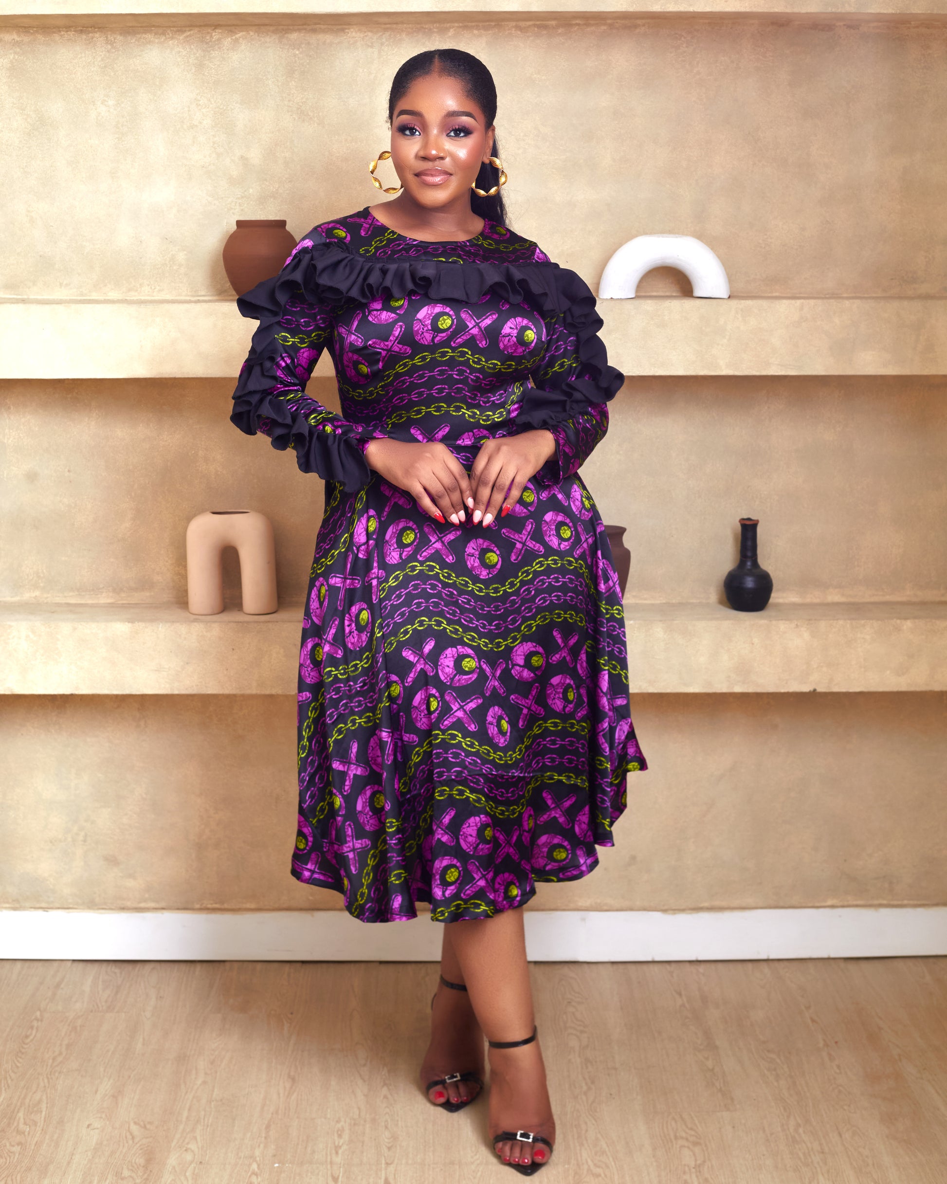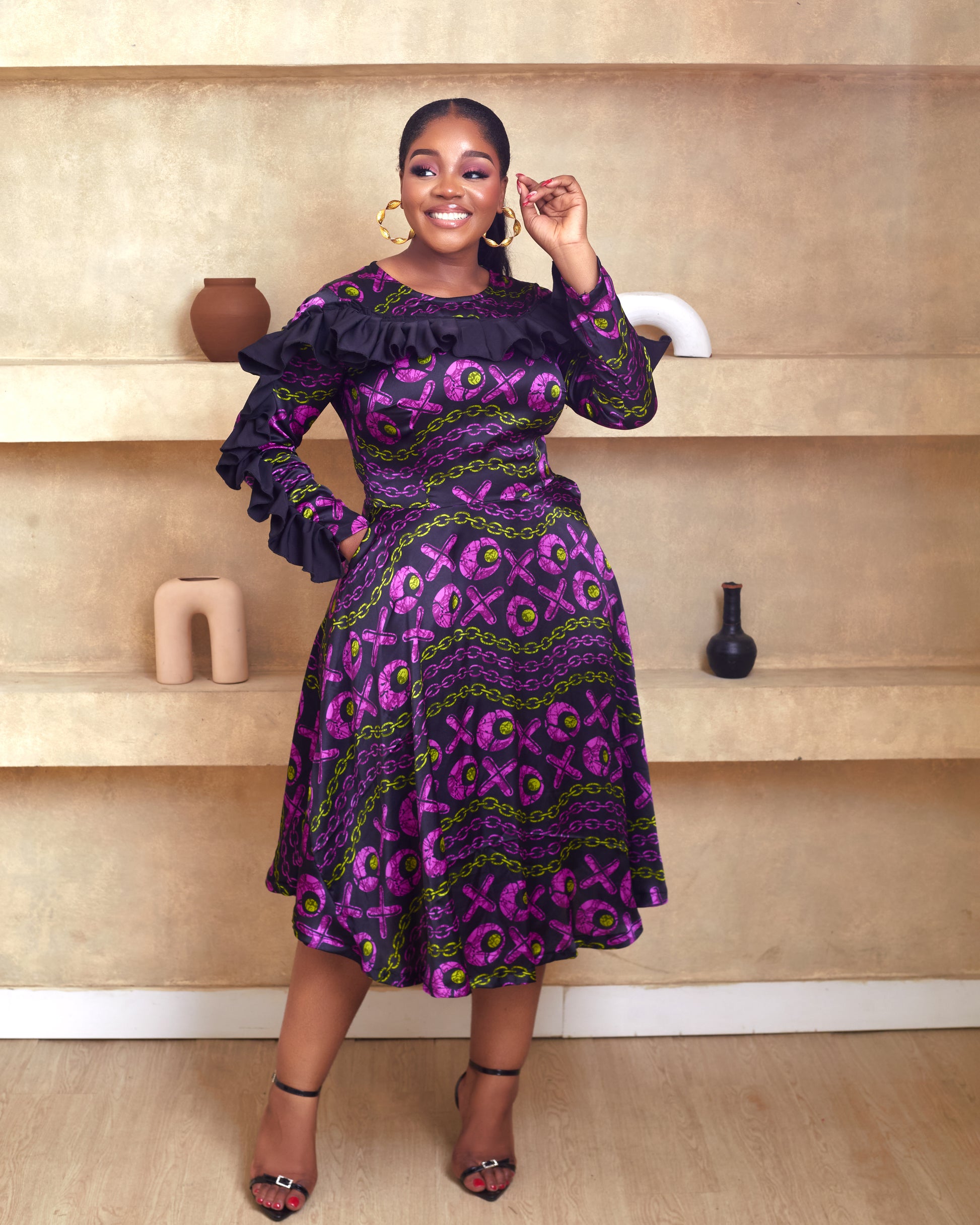 This dress blends african print silk with dainty frills, featuring a unique fit and flare design. . Sleeves also feature the charming frill design. Made from a mix of silk and chiffon, this mid-length dress is both stylish and cultural.