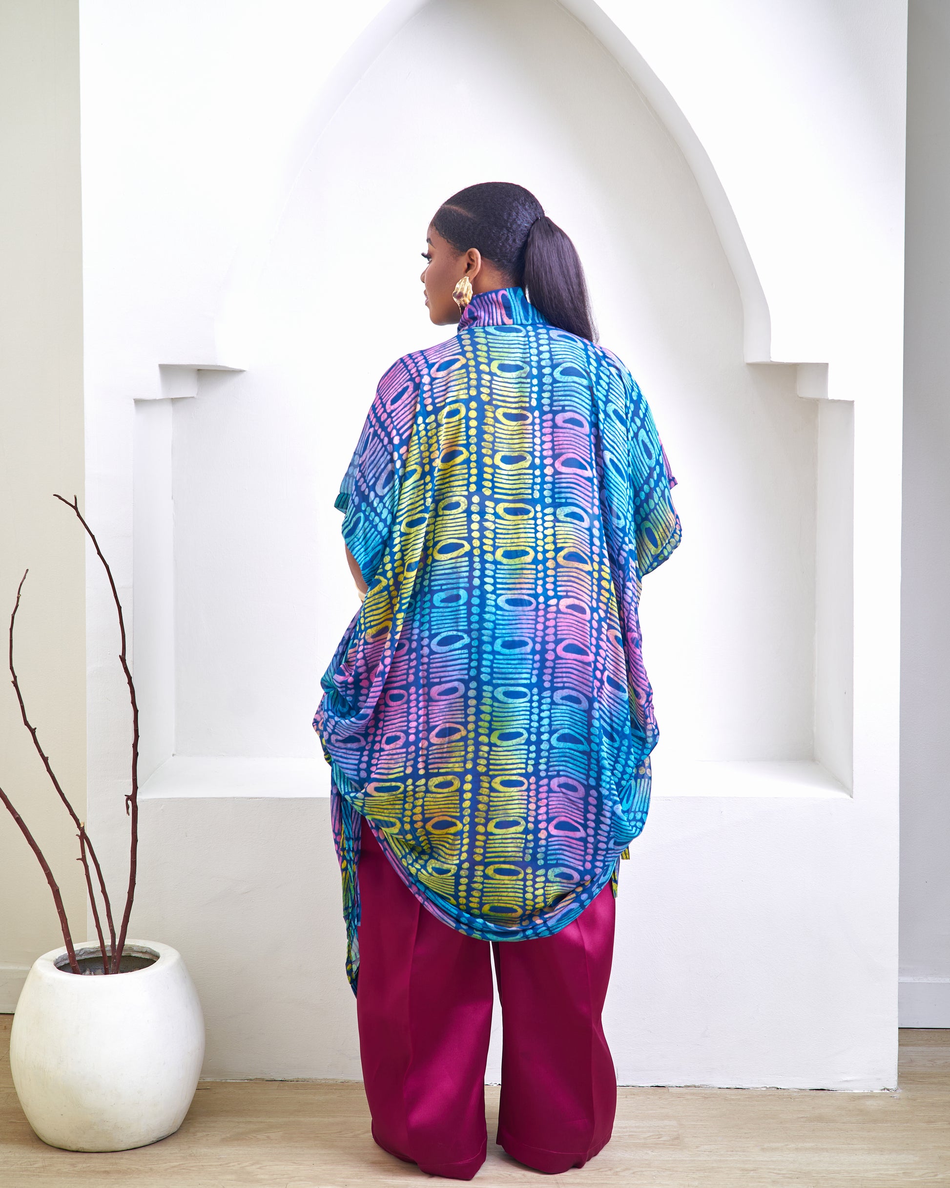 This stylish 2-piece pant set is crafted from vibrant chiffon african print fabric. The top, featuring a draw string boubou long top design. The pants is a luxurious Mikado silk pant measure 45 inches in length and are adorned with pockets on both sides.