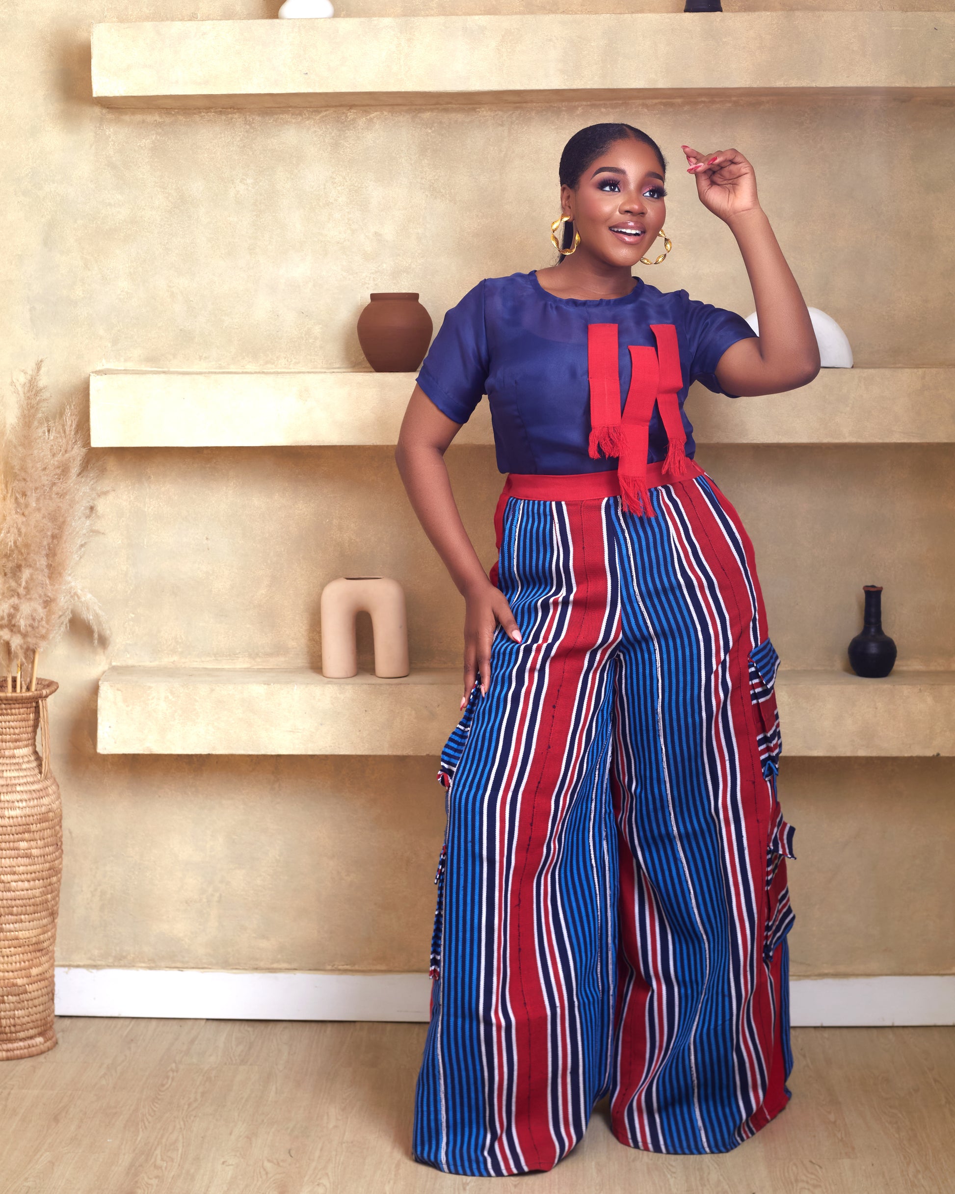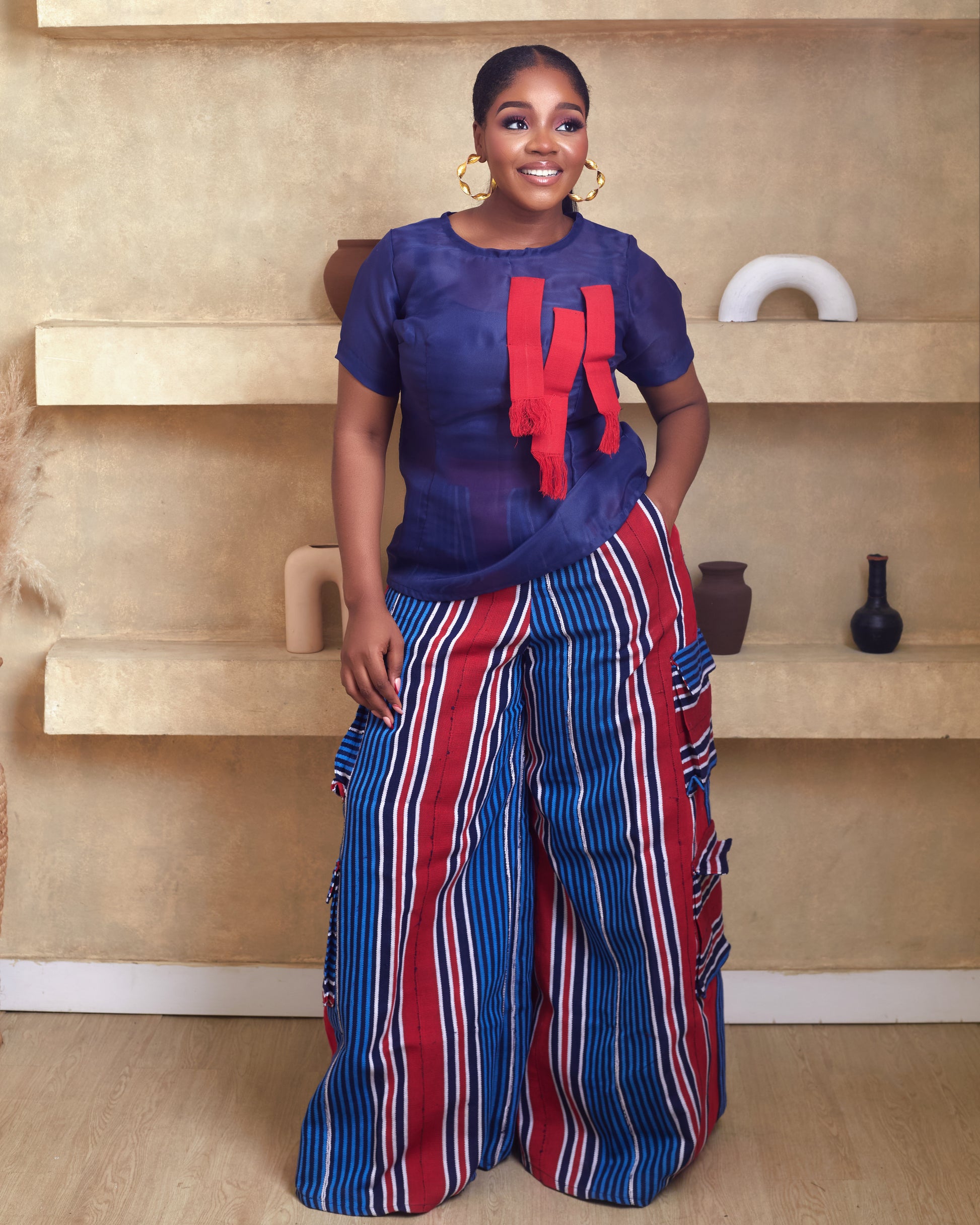 This aso oke pant made from traditional west african fabric into a classy palazzo pant with detailed cargo styled pockets for women. pants trousers comes with elastic waistband at the back. Classy blouse styled with stripes of aso oke design and zipper at back