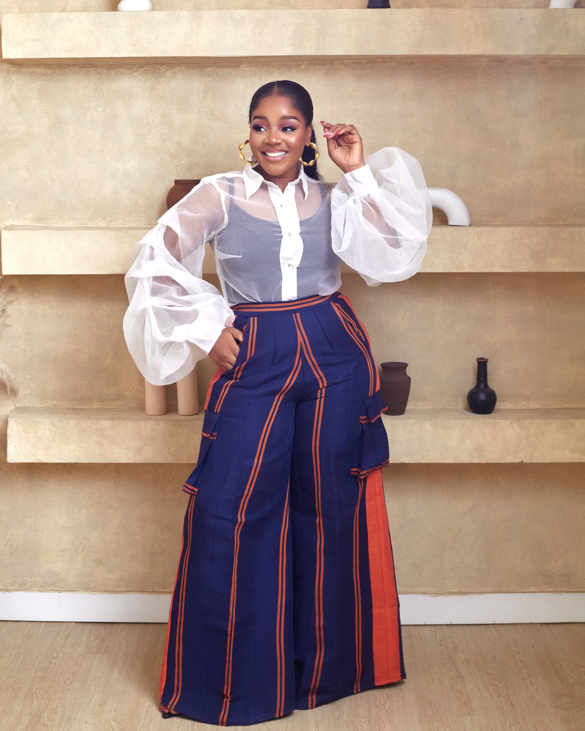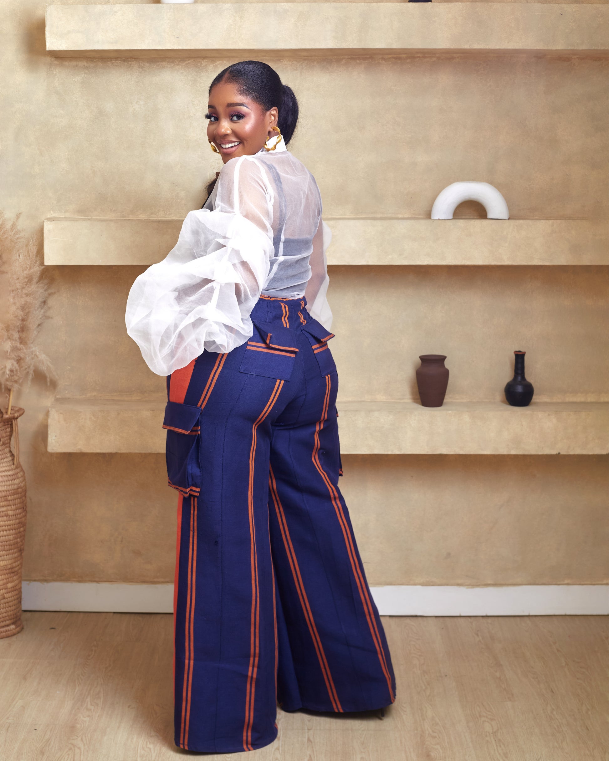 This aso oke pant made from traditional west african fabric into a classy palazzo pant with detailed cargo styled pockets for women. pants trousers comes with elastic waistband at the back. Super soft button down shirt with exaggerated bubble sleeves blouse.