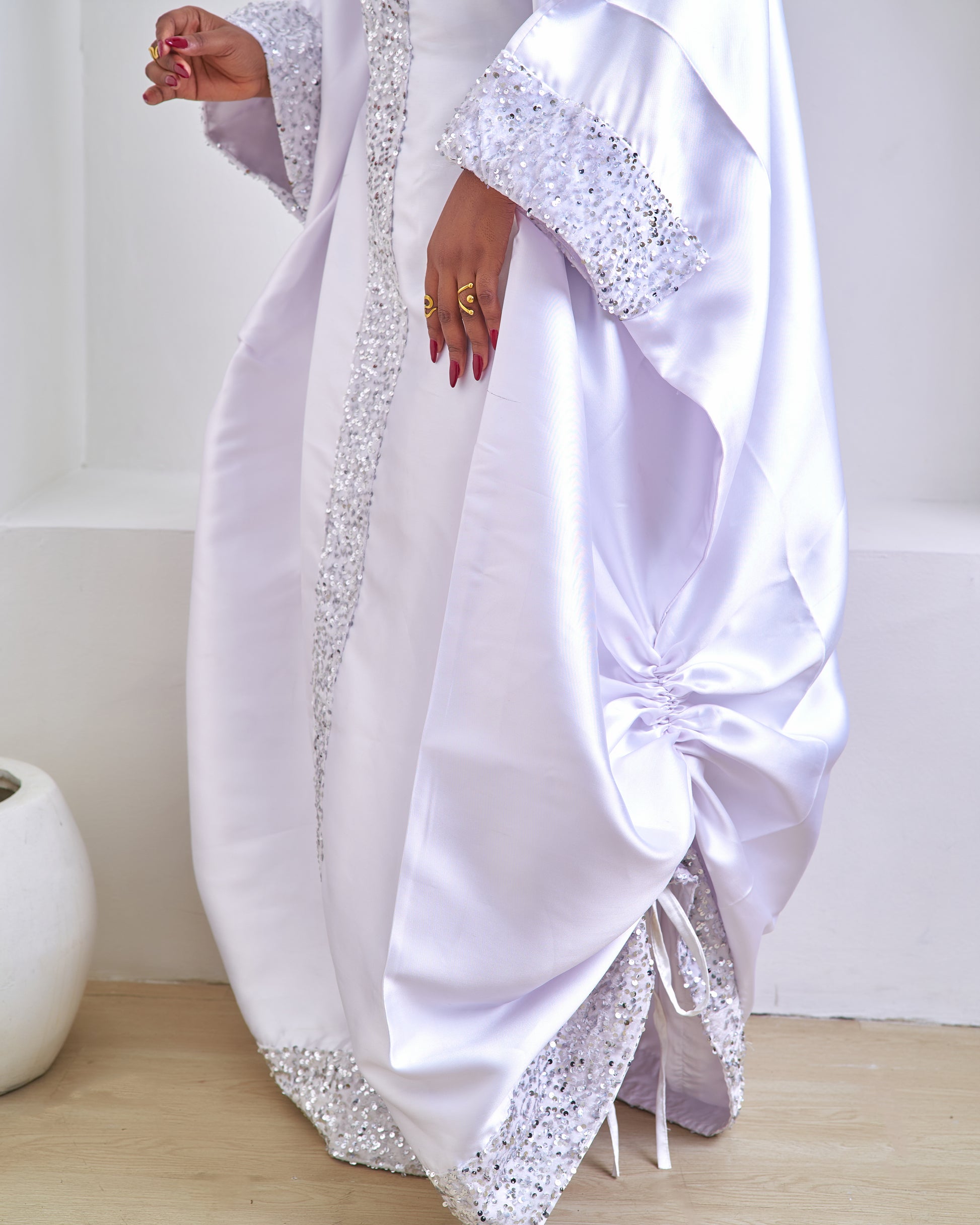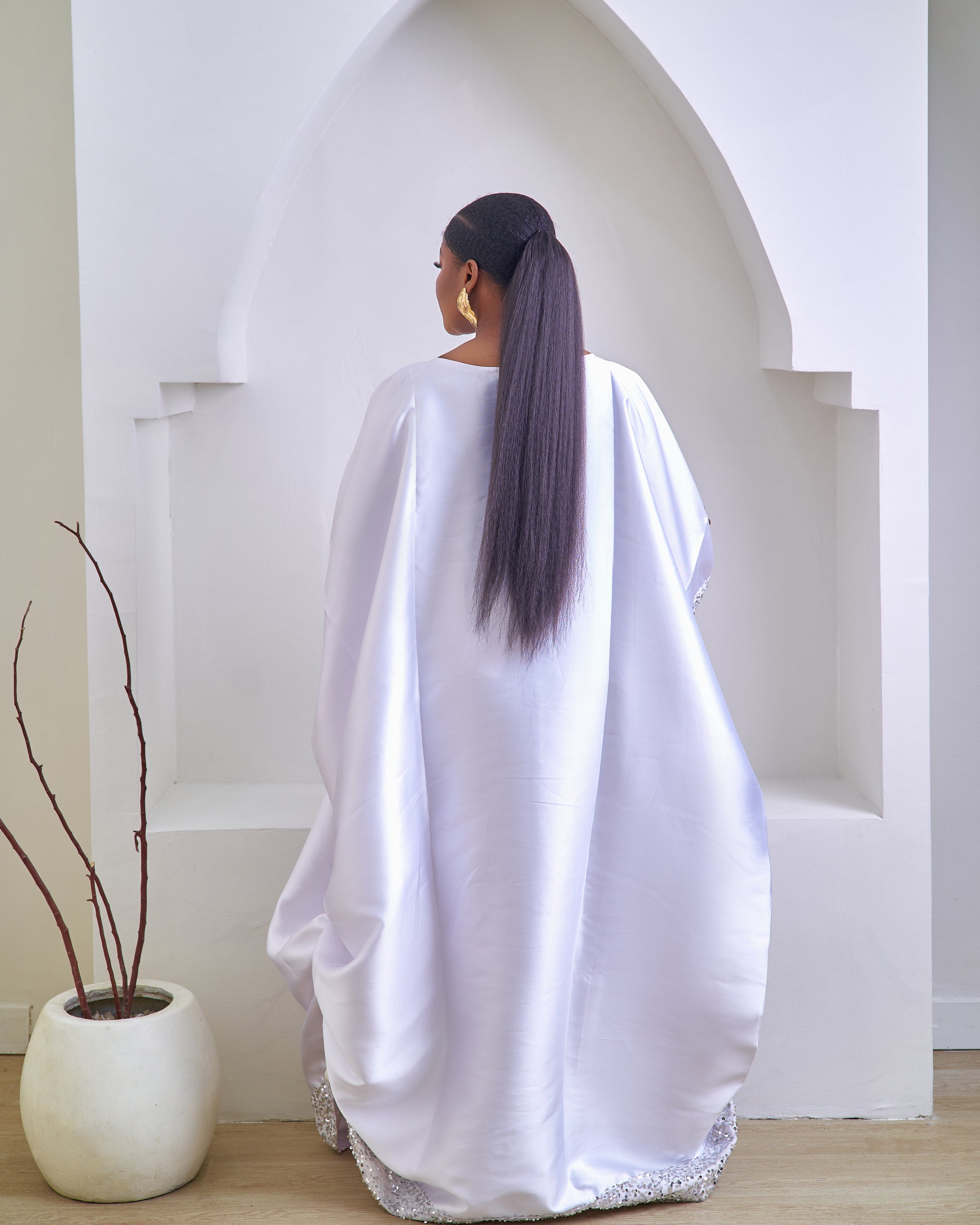Zuri Celestial White African Boubou, a luxurious maxi boubou crafted from rich, flowing fabric, designed for the graceful and sophisticated wearer. This elegant piece features a pristine white hue with intricate silver embellishments cascading down the front and sleeves, adding a touch of opulence. The boubou’s loose, voluminous fit and round neckline create a regal silhouette, ensuring both comfort and timeless style.