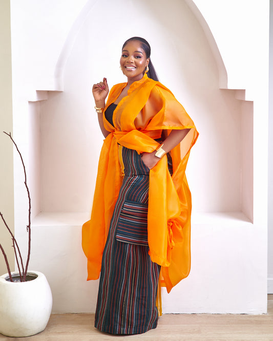 Bolanle Aso Oke African Hand woven Pant with Luxurious Organdy Exergerated Button down Shirt